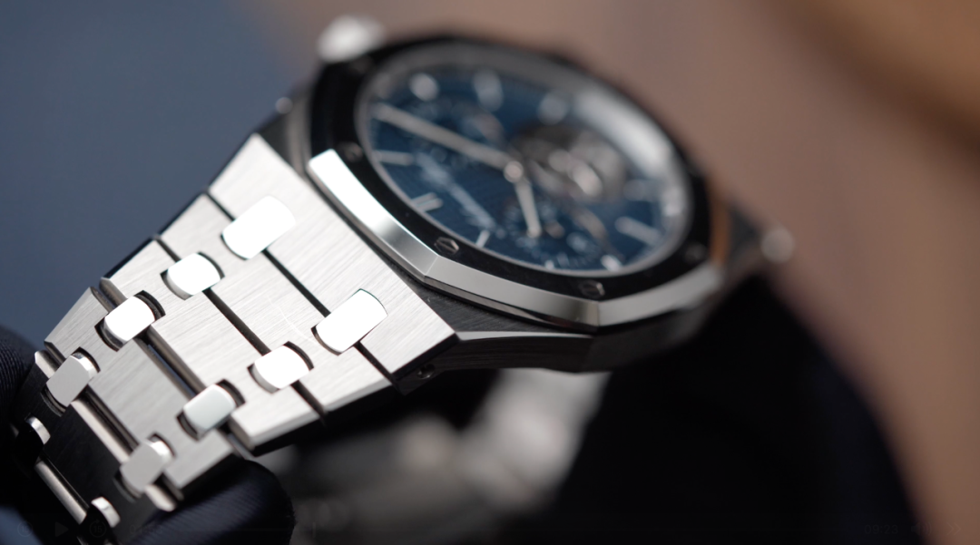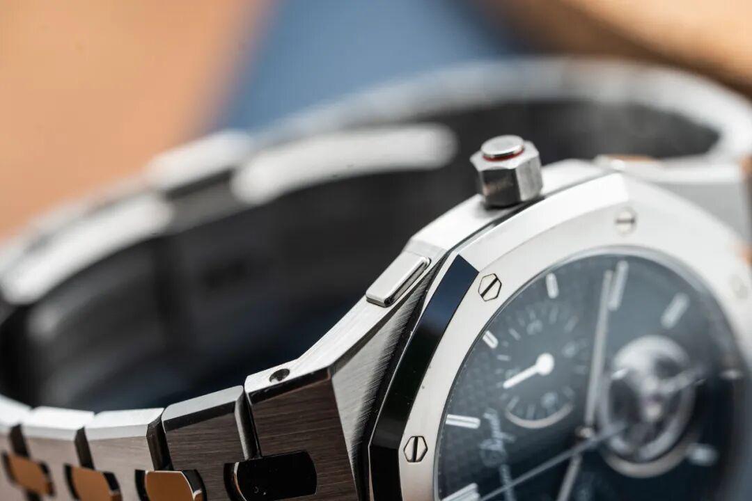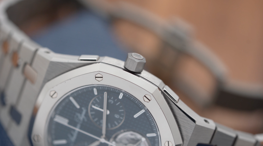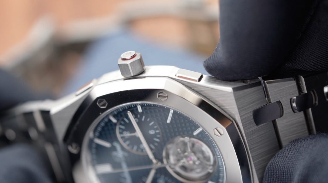 而爱彼这枚RD,无论是计时功能的启动,还是暂停、归零,或者是计时运作中的飞返,上下两个按钮都保持了完全一致的操作质感,轻轻地按下,机械就会回应你。