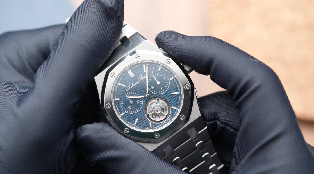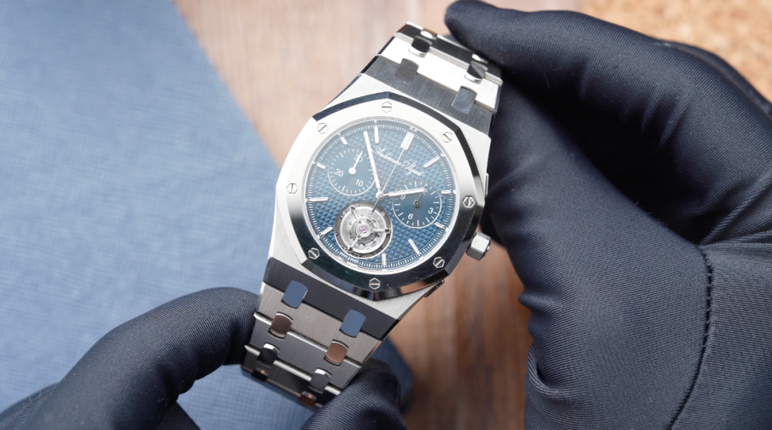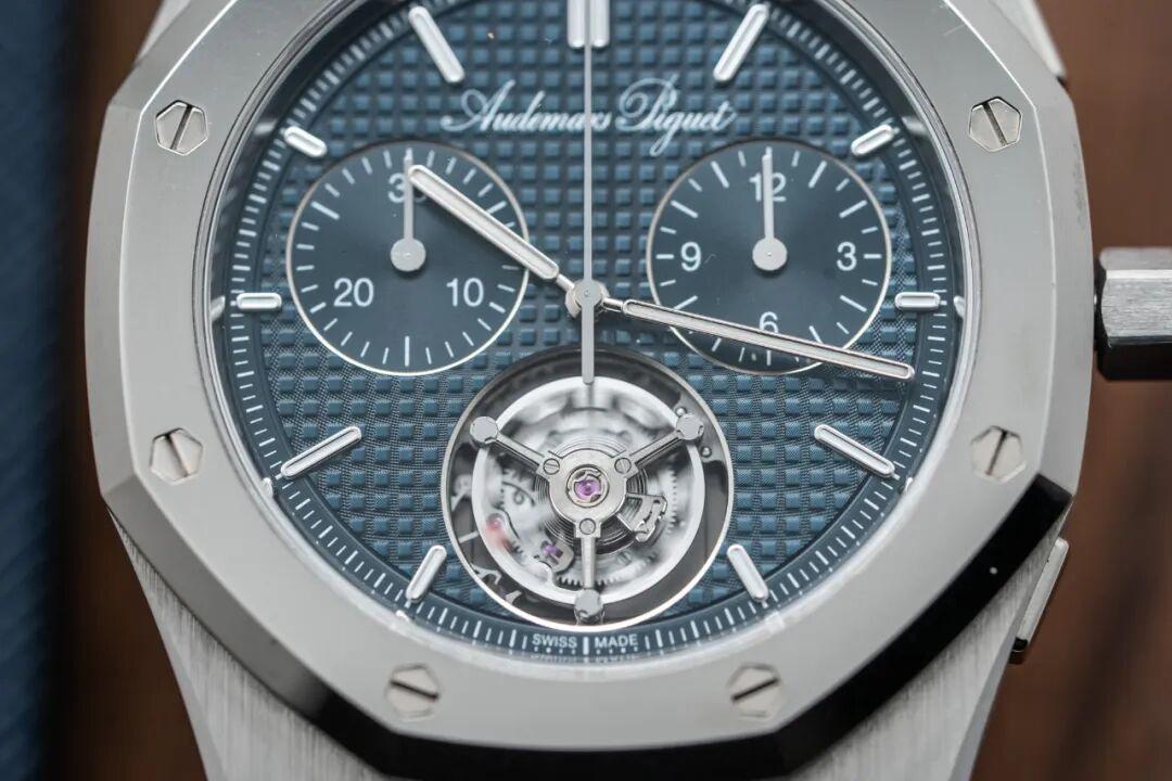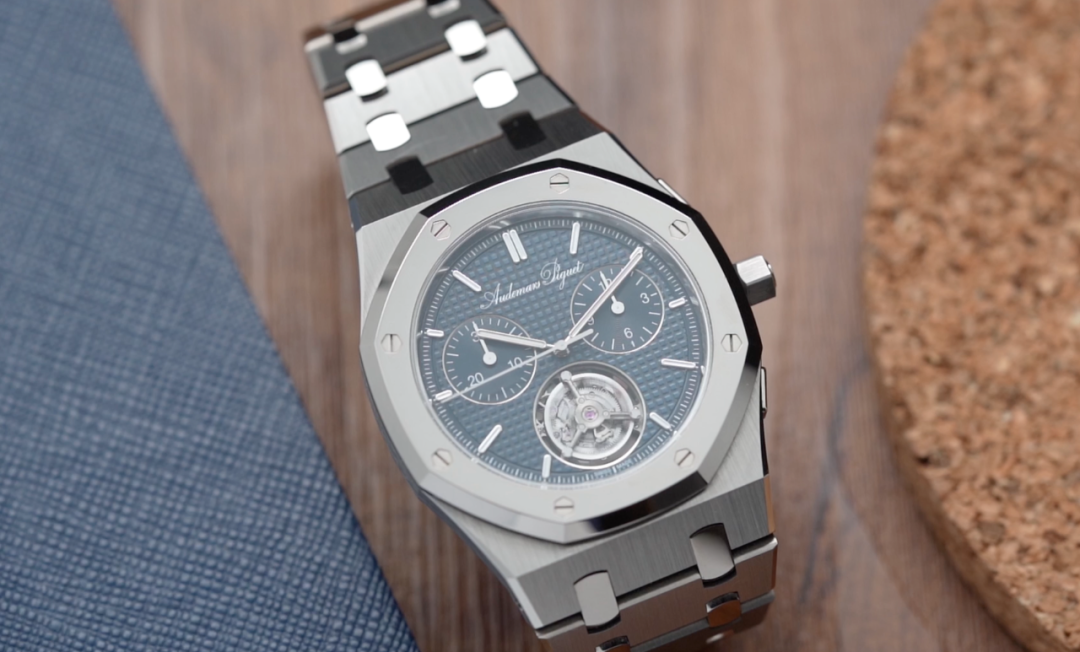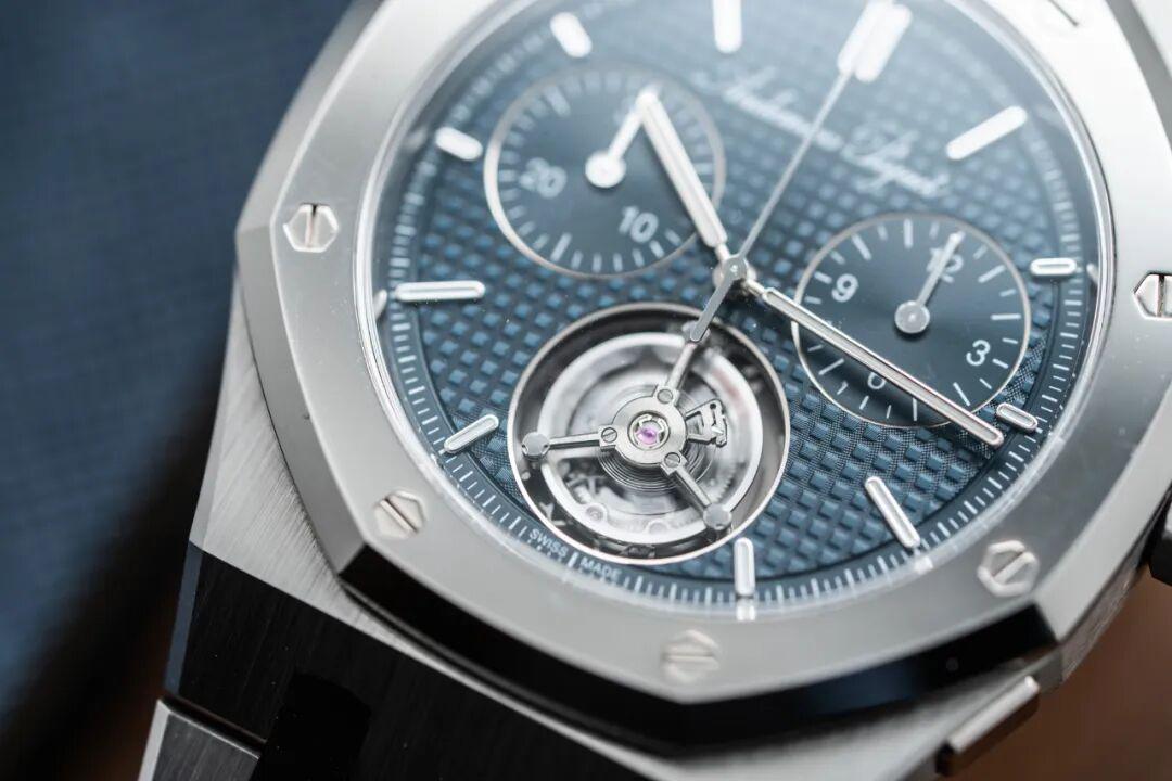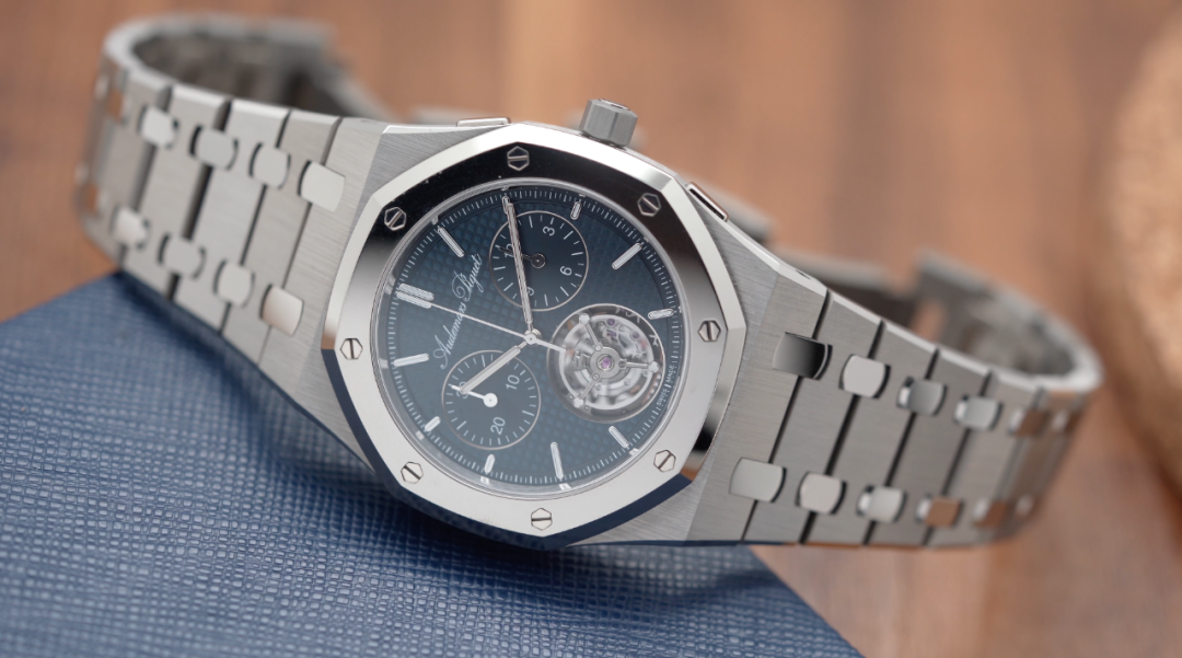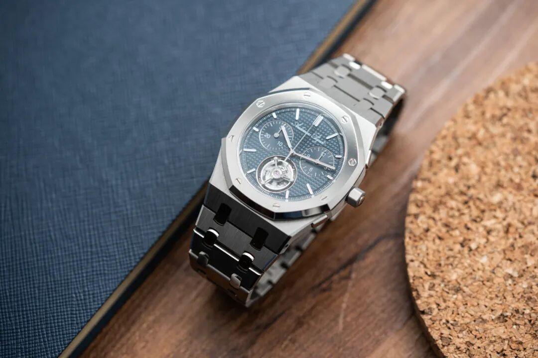 今天,答案已经揭晓,它就是我手里这枚皇家橡树系列“JUMBO”自动上链浮动式陀飞轮超薄计时码表RD150周年纪念款。