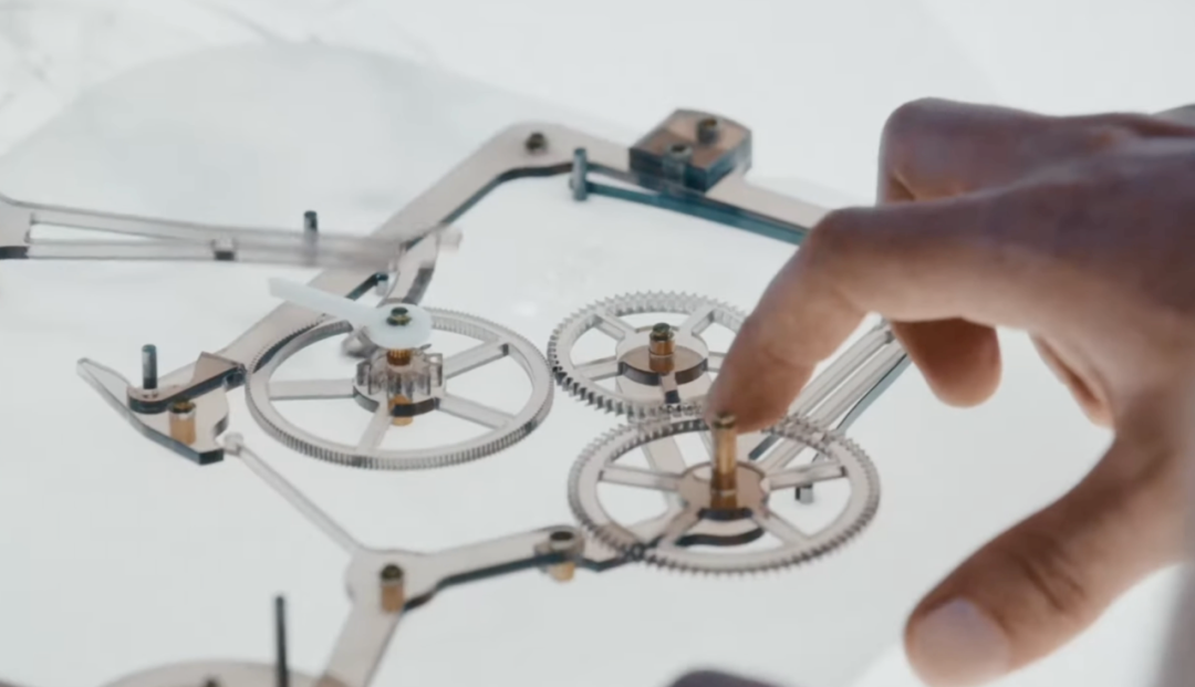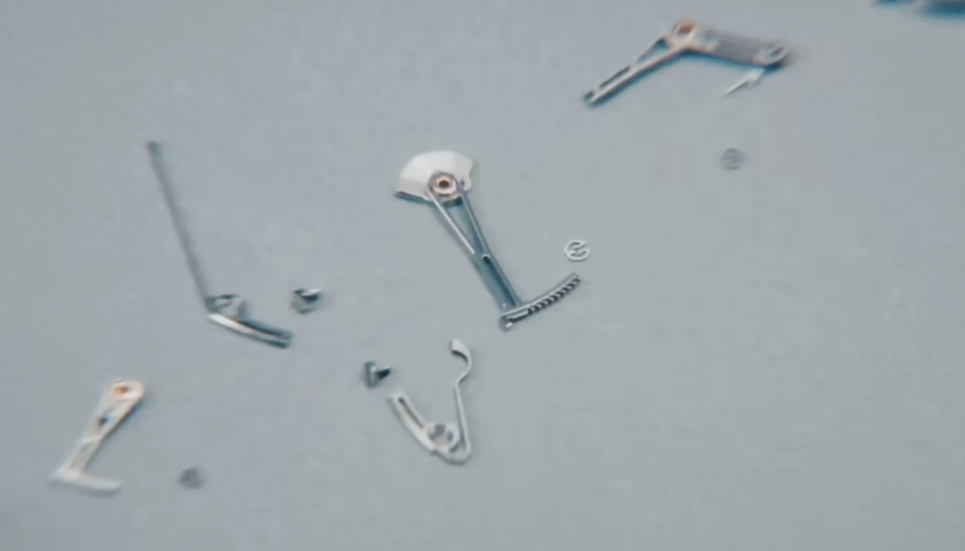 同时达成轻触即击发,就像绷紧的橡皮筋只要施以极小的压力,积蓄的能量就能瞬间释放,达成计时指针逆跳归零的动作。指针在0.15秒内跳返原位,这个时间也是爱彼通过大量实验得出的人眼能够动态识别的指针复位的最短时间。而这个复位时间是0.15,还是0.01秒,还是1秒,爱彼也能通过替换零件精确掌控。被释放的力会随着齿轮齿条运转,再次积蓄瞬间绷紧,等待下一次操作。
