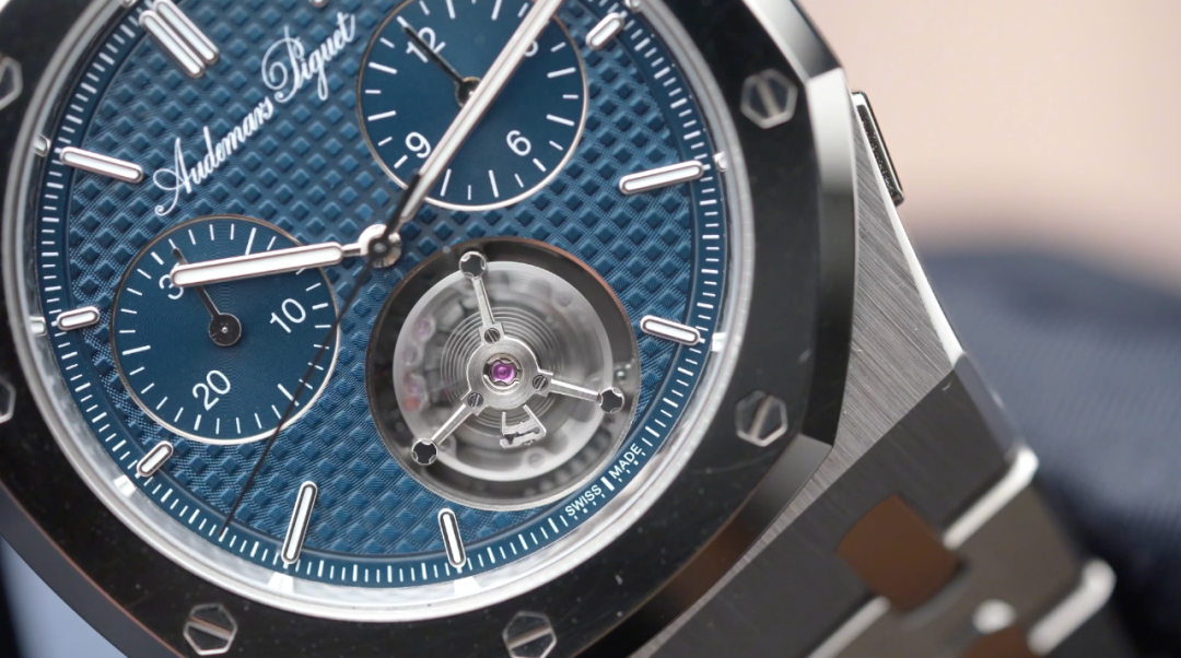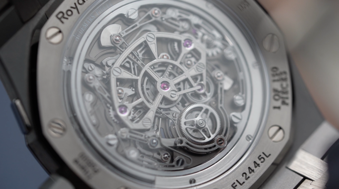 爱彼为这颗陀飞轮重新构思整个框架,缩小体积,以融入已经很复杂的Calibre 8100机芯之中。整个机芯采用大量钛金属材质以确保这枚精密机芯的高耐久度和轻量化特性。